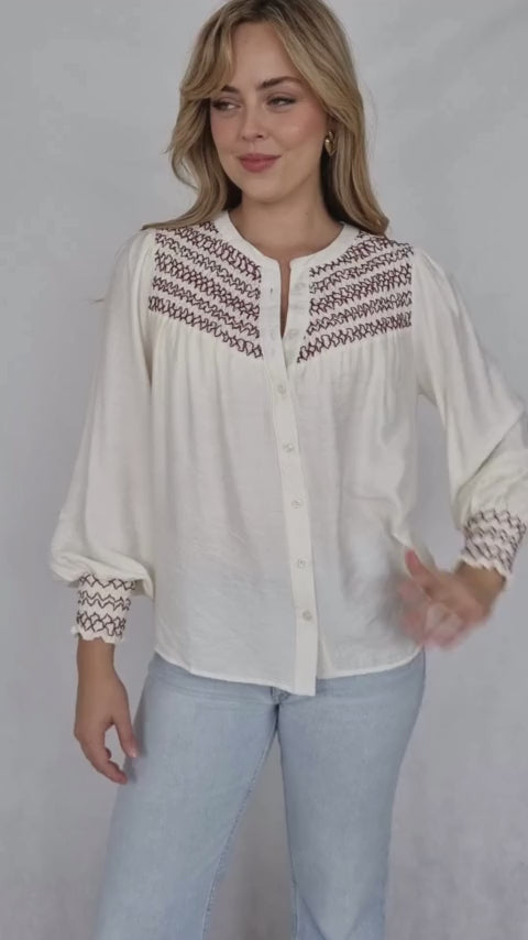 This elegant blouse is crafted from a luxurious cream-colored fabric and features delicate red smocking detail at the neckline and cuffs. The long sleeves and relaxed fit create a comfortable yet sophisticated look, perfect for both casual and dressier occasions. The subtle smocking adds a touch of texture and visual interest, making it a versatile piece for any wardrobe.