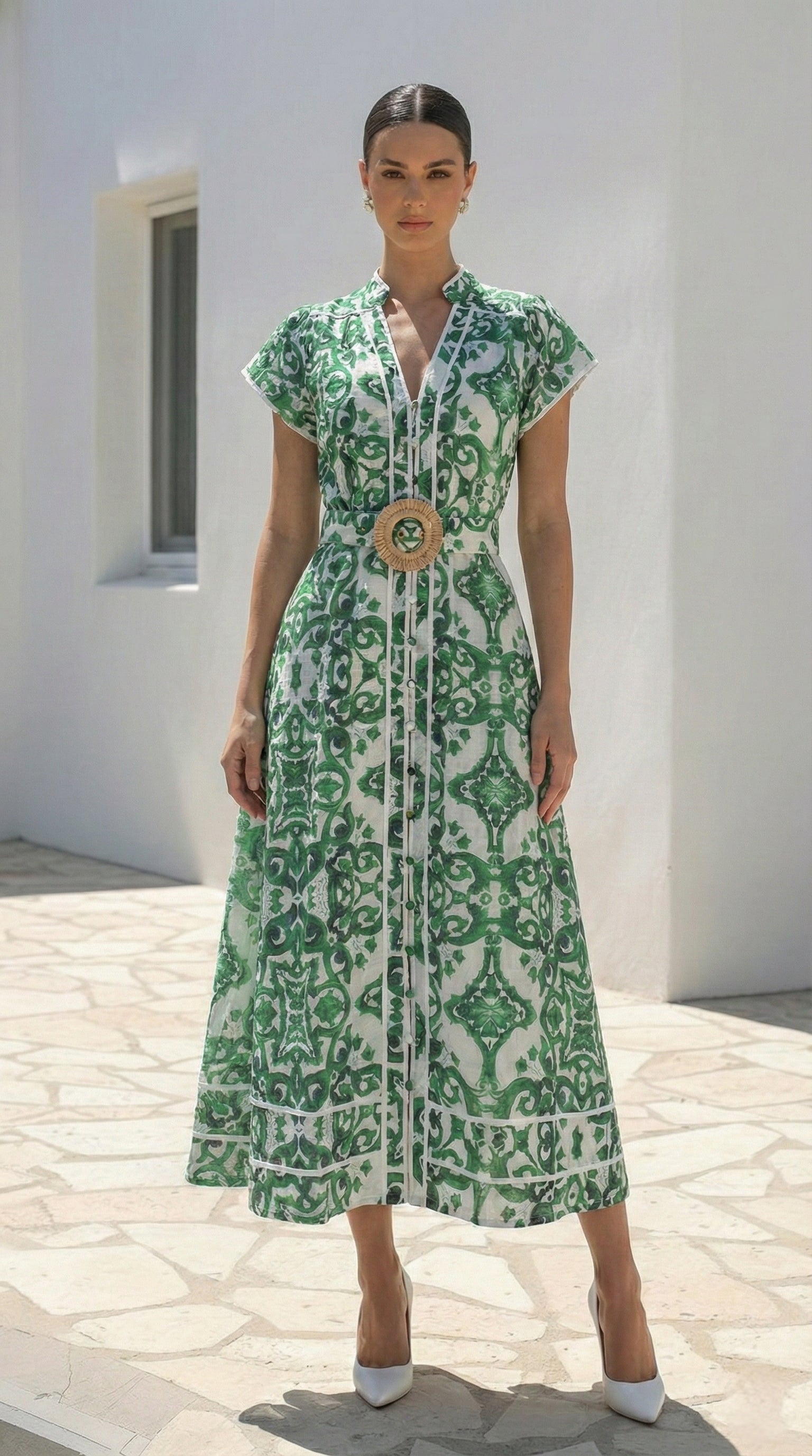 Elevate your wardrobe with the Estelle Dress in Green—a sophisticated piece that commands attention wherever you go. The eye-catching geometric print paired with a graceful, flowing silhouette creates an instantly polished look that works beautifully for both leisurely escapes and special occasions.