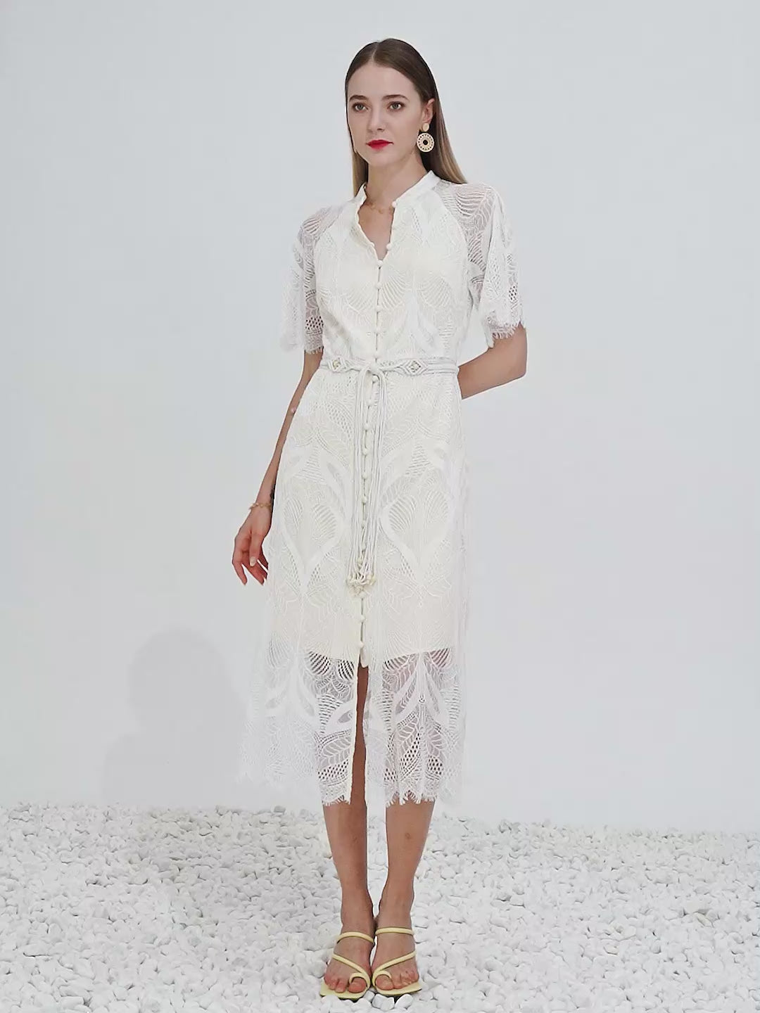 The delicate lace and romantic silhouette of the Lilou Lace Long Dress evoke a sense of timeless elegance. This stunning mini dress from G.D.S will is a show stopping style perfect for all your upcoming events. Crafted from intricate lace this striking style features a mandarin collar, functional button front, a scalloped edge sleeve and a detachable waist tie.  A gorgeous statement piece that is sure to make you feel fabulous every time you slip it on, pair with fine jewellery for your upcoming events.