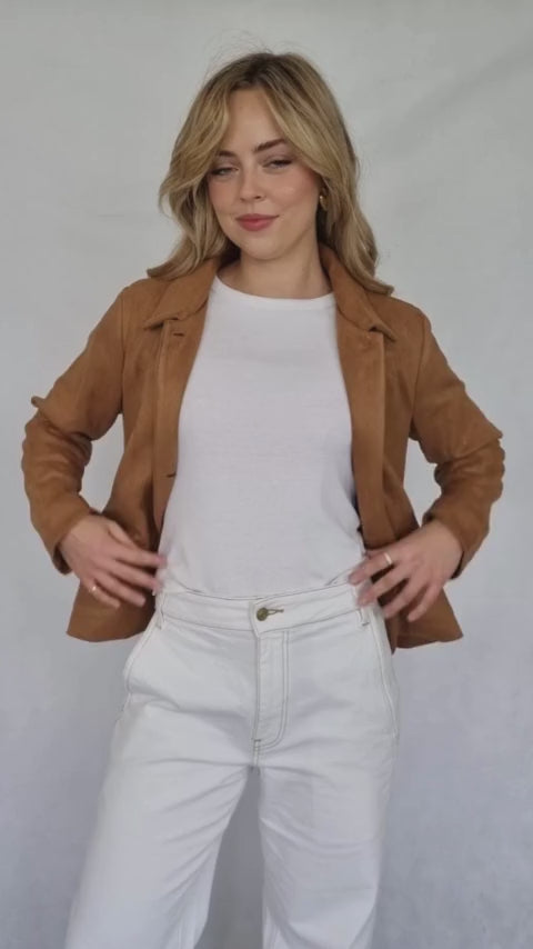 This brown-colored jacket offers a refined and effortlessly chic style. The simple, single-breasted design is both classic and contemporary, featuring a notched lapel and patch pockets. The soft, plush fabric suggests warmth and comfort, making it a versatile piece for various occasions.