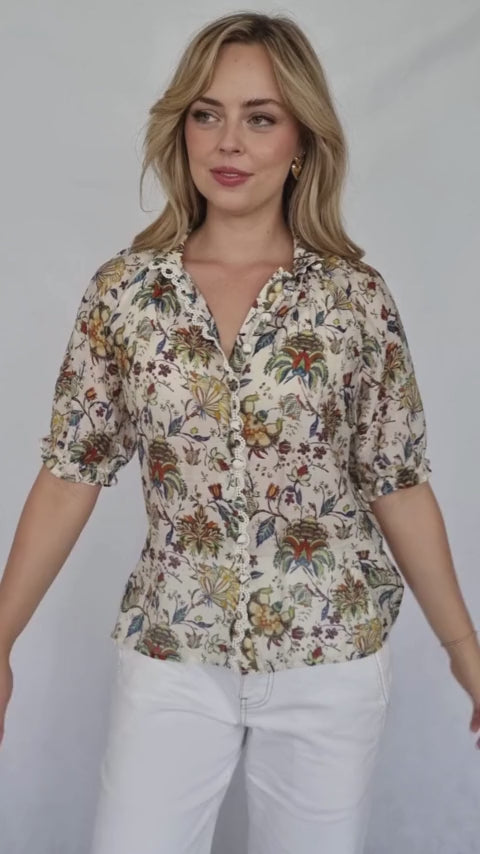 This charming beige blouse features a delicate floral print. The short sleeves and relaxed fit create a comfortable and feminine silhouette. The intricate detailing of the print and the subtle ruffle at the collar add a touch of elegance, making it a versatile piece for various occasions.
