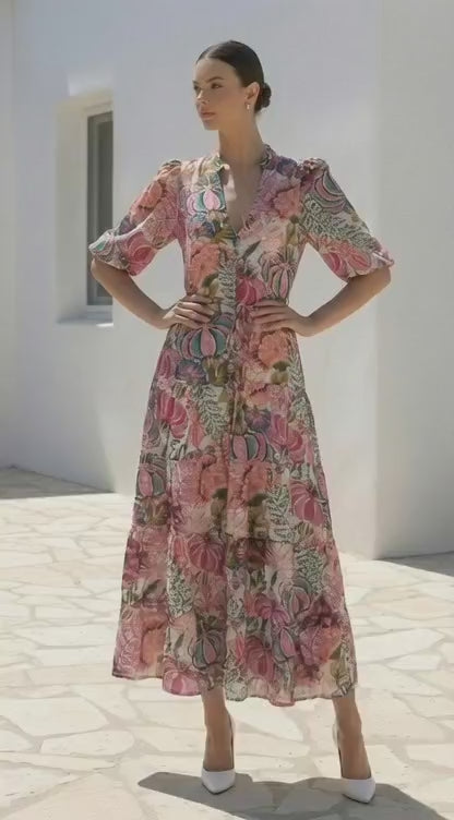 This maxi dress is a vibrant celebration of color and print. The flowing skirt and three-quarter sleeves create a romantic silhouette, while the bold floral pattern in shades of pink, red, and blue adds a touch of bohemian flair. The cinched waist creates a flattering shape, and the overall design is both playful and sophisticated.